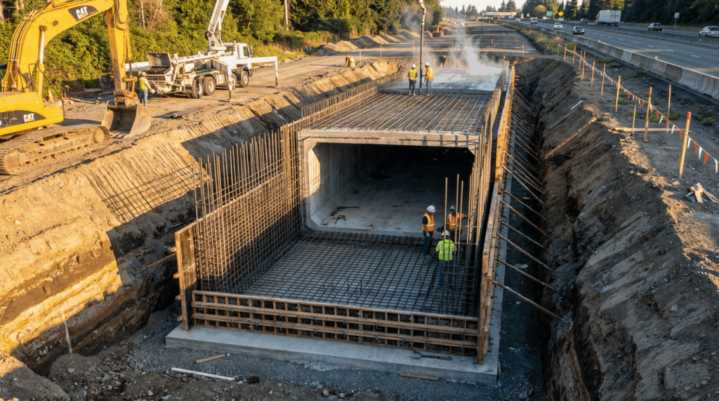 An RCC box culvert is a rigid cross drainage structure constructed using a reinforced concrete culvert system that enables water flow beneath highway or railway embankments. In modern rcc box culvert design, the structural response is influenced not only by self-weight and earth pressure, but also by moving vehicular loads that introduce dynamic stress variations and complex internal force patterns. As considered in box culvert design as per IRC, traffic loading plays a critical role in defining the internal force envelope and overall safety requirements.